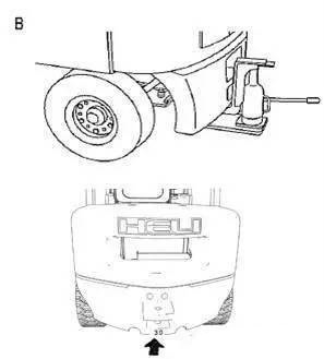 4. 把叉車頂起到輪胎依然稍 稍與地面接觸的程度,車架下面放置墊塊,以防止下落。 當更換前輪胎時,在前部放 置墊塊。當更換后輪胎時, 在后部放置墊塊。