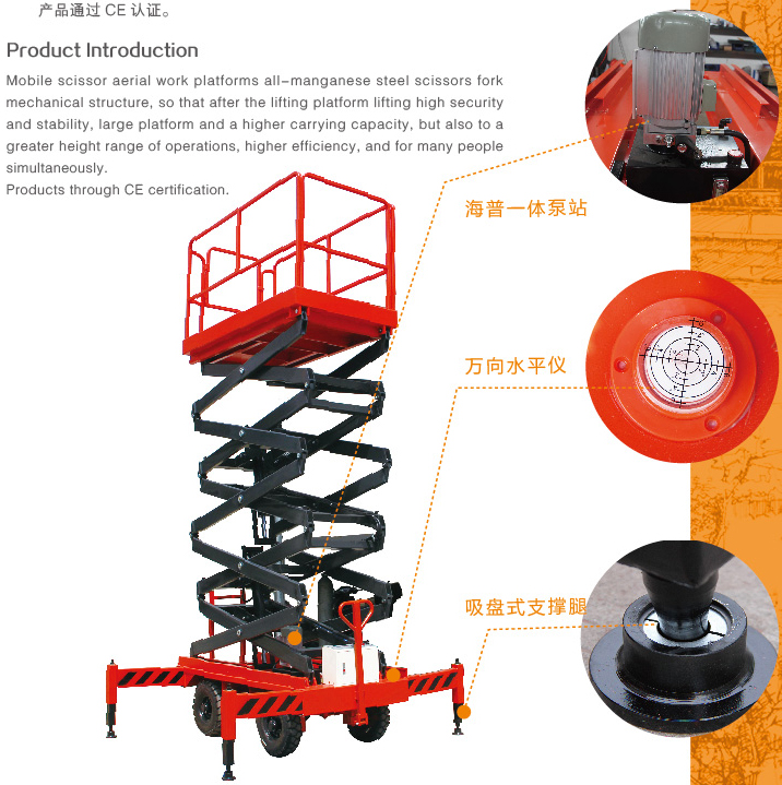 移動(dòng)剪叉式高空作業(yè)平臺(tái)采用全錳鋼剪刀式機(jī)械結(jié)構(gòu),使升降臺(tái)起升后有很高的安全穩(wěn)定性,寬大的作業(yè)平臺(tái)和較高的承載能力,也使高空作業(yè)范圍更大,效率更高,并適合多人同時(shí)作業(yè)。
